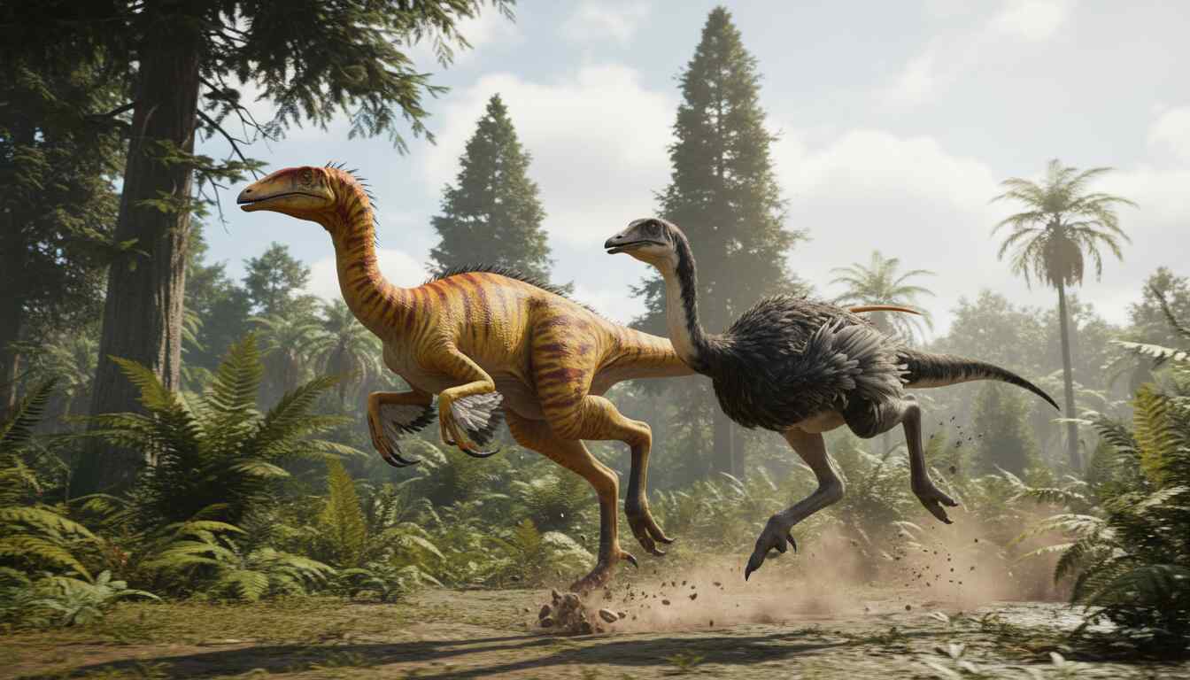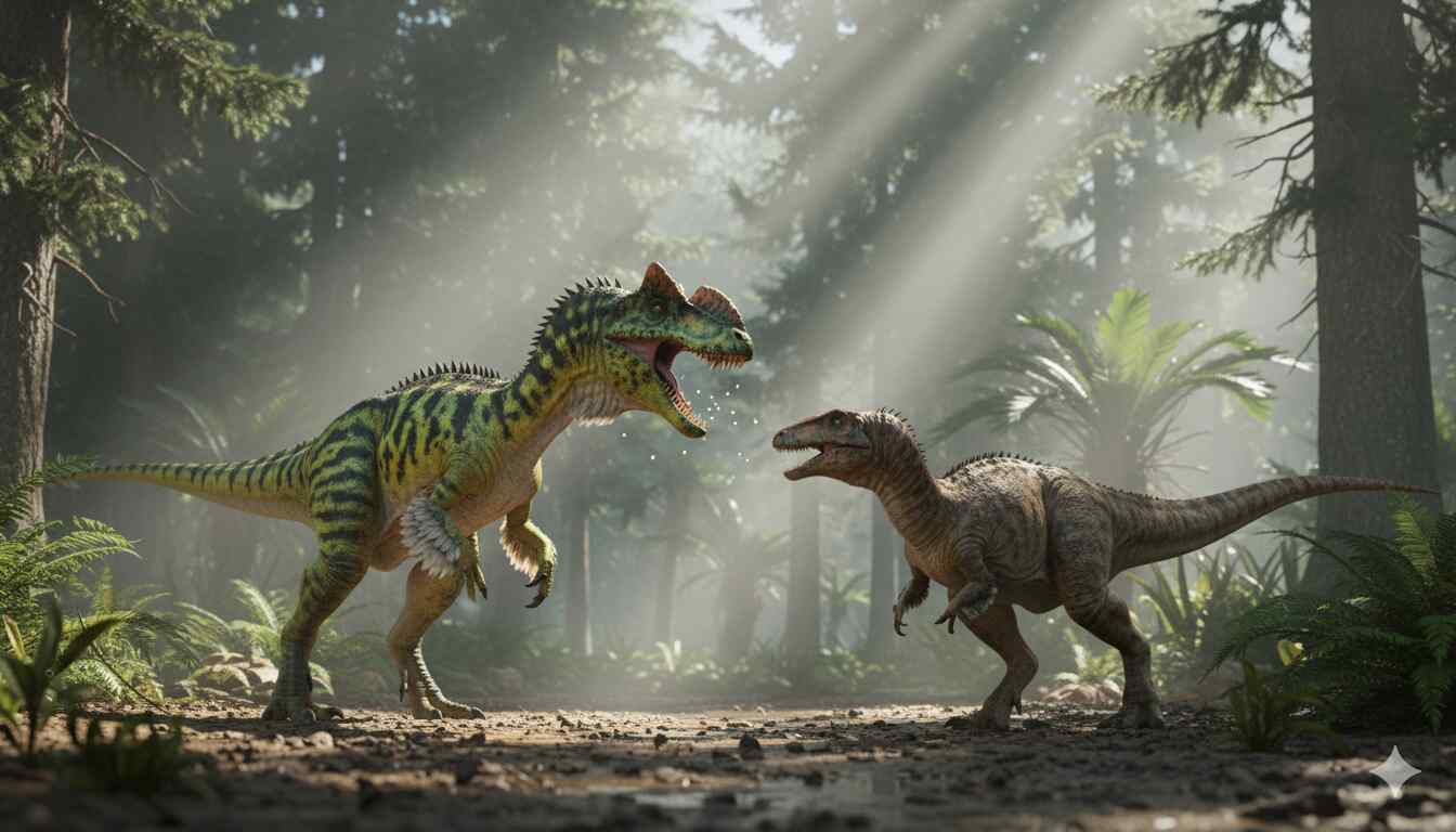初期獣脚類同士。脚力と瞬発力の差が勝敗を分ける。