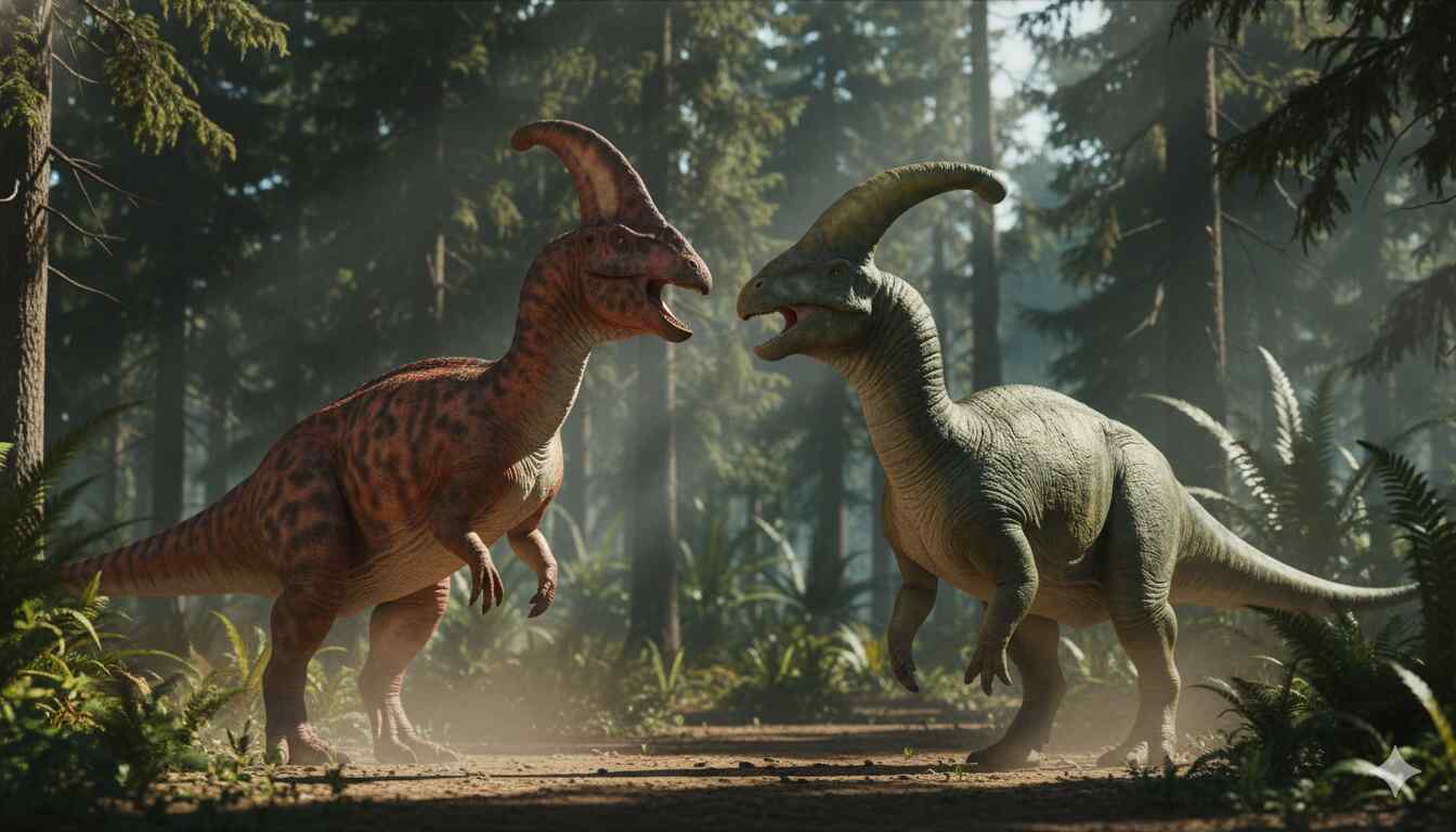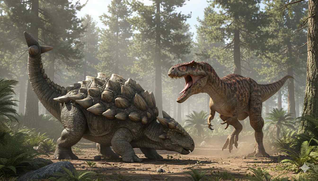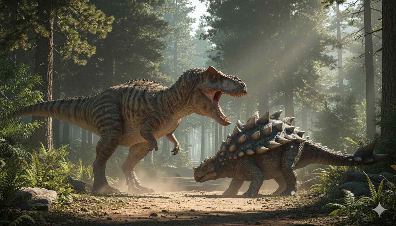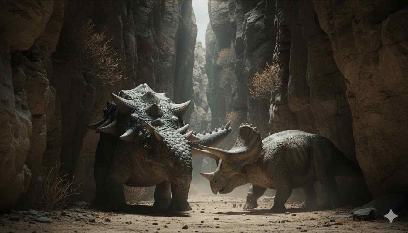 荒れ地。重装甲のノドサウルス類 vs 機動力ある肉食。